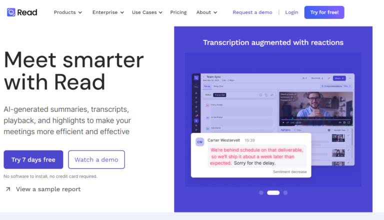 Read is a platform that improves meeting wellness in a hybrid world by offering better scheduling, real-time analytics, meeting summaries, transcription, video playback, automated recommendations, and more.